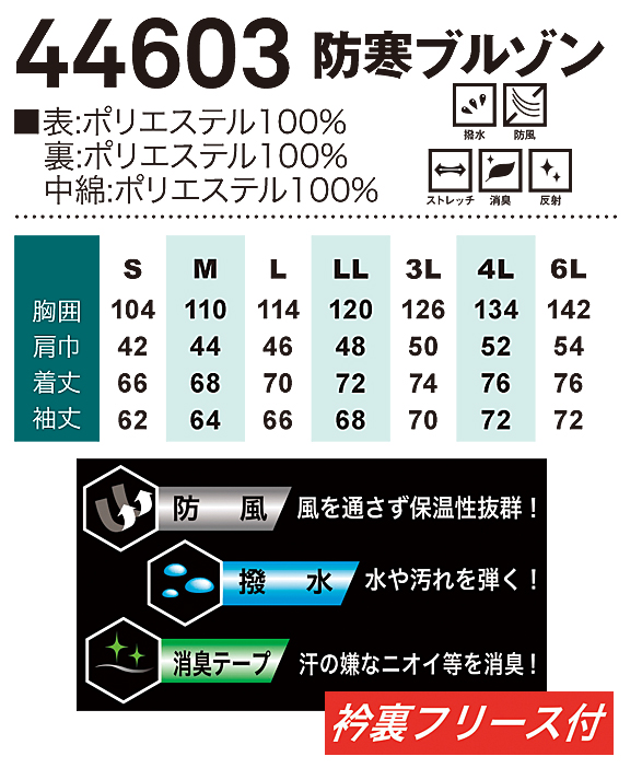 SW44603 防風ストレッチ素材防寒ブルゾン 撥水・消臭 反射パイピングによる高視認性