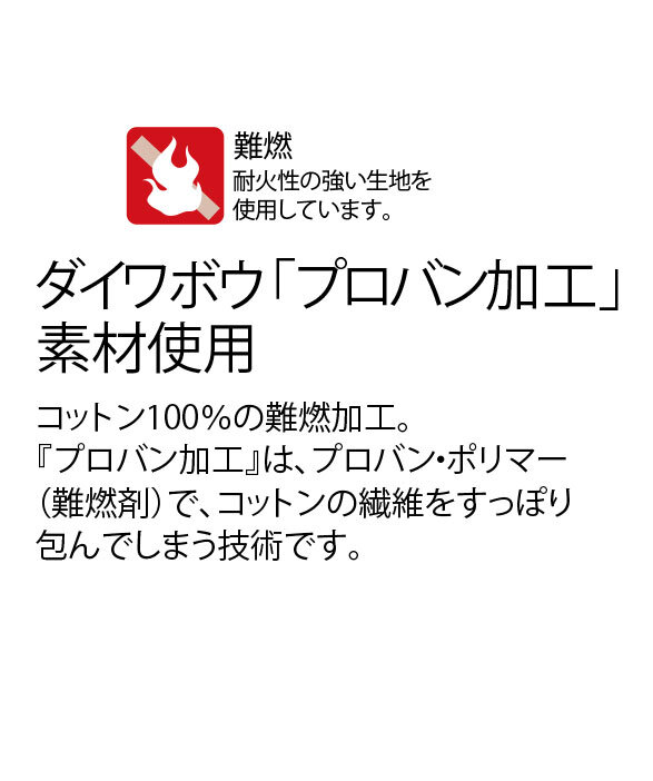 『プロバン加工』は、コットンを難燃剤(プロバン・ポリマー)ですっぽり包んでしまう技術で、耐火性の強い生地です。