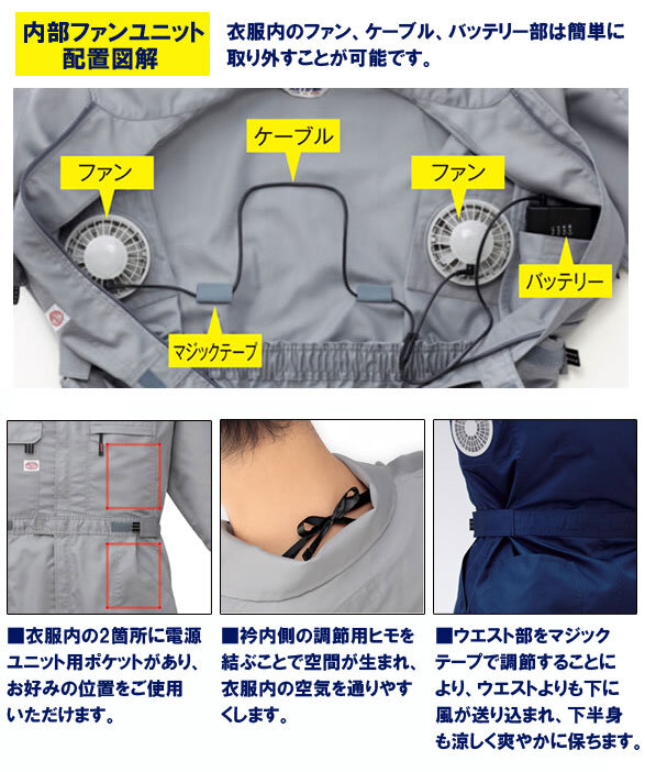 衣服内部のファン、ケーブル、バッテリー部は簡単に取り外すことが可能です。