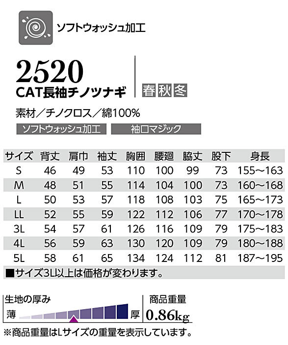 A2670 Auto-bi ゆったりサイズ長袖つなぎ服 強力三重環縫・YKKファスナー使用