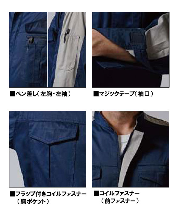 袖口マジックテープ、フロントファスナーも前立て付き(マジックテープ)で、金具やプラスチックパーツが露出していないので車やバイク整備関係には最適です。