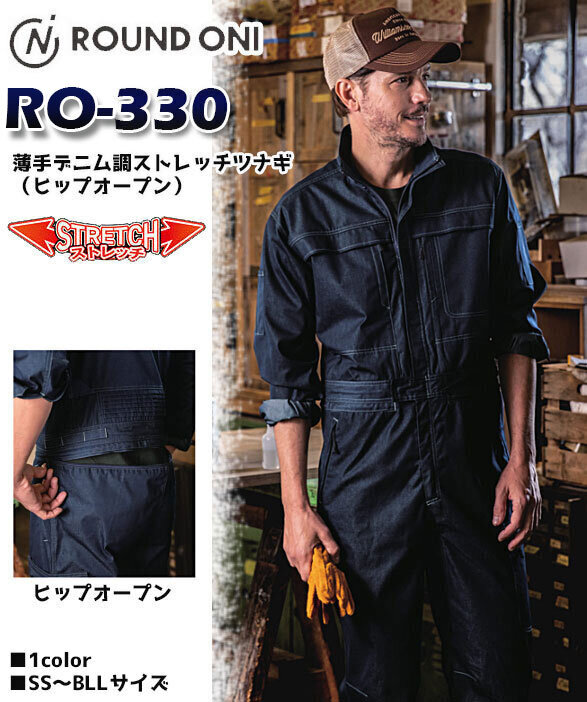 丸鬼商店 RO-330 デニム調ストレッチつなぎ服(ヒップオープン)