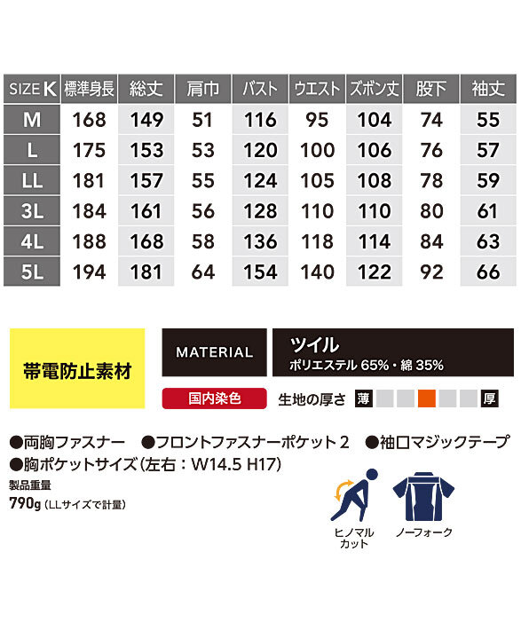 ■袖口:マジックテープ ■左袖ポケット ■製品重量:790g(LLサイズ)