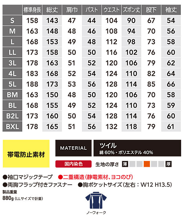■袖口:マジックテープ ■左袖ペン差し ■製品重量:880g(LLサイズ)