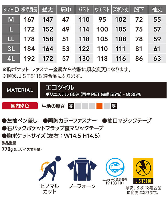 ■袖口:マジックテープ ■左袖ペン差し ■製品重量:770g(LLサイズ)