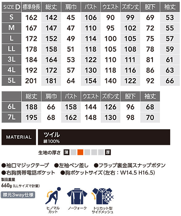 ■右胸携帯電話ポケット付き ■製品重量:660g(LLサイズ)