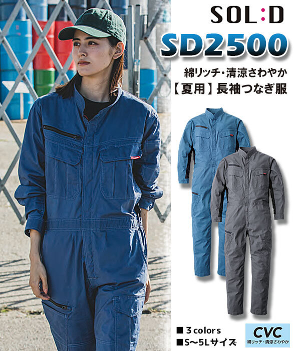 SOL:D ソルディ SD2500 CVC綿リッチ・清涼素材の脇メッシュ夏用長袖ツナギ服