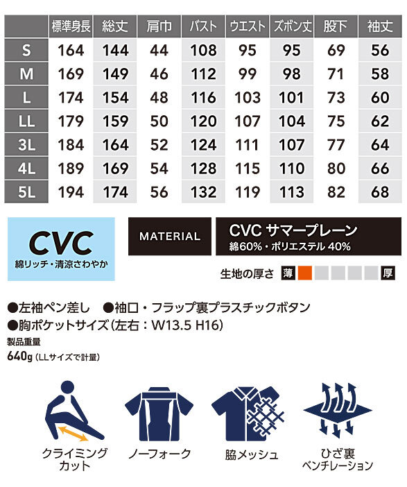 ■右胸・右脚ポケット:ビスロンファスナー ■製品重量:640g(LLサイズ)