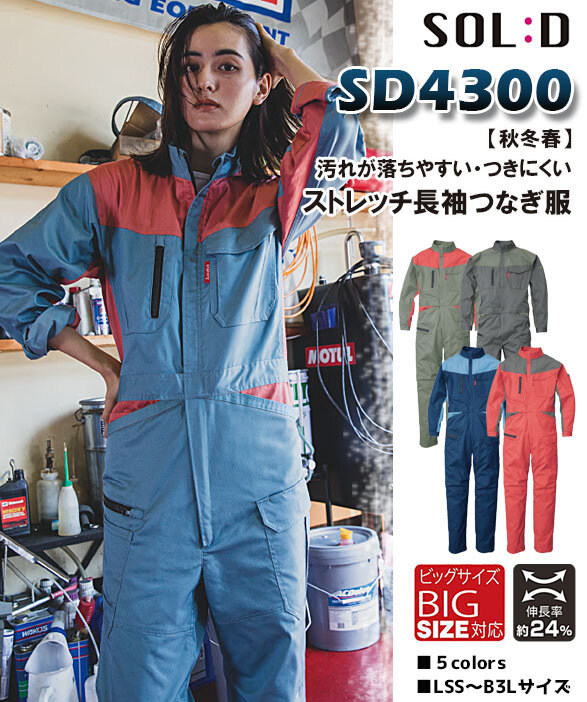 SOL:D ソルディ SD4300 防汚加工・ストレッチ長袖ツナギ服
