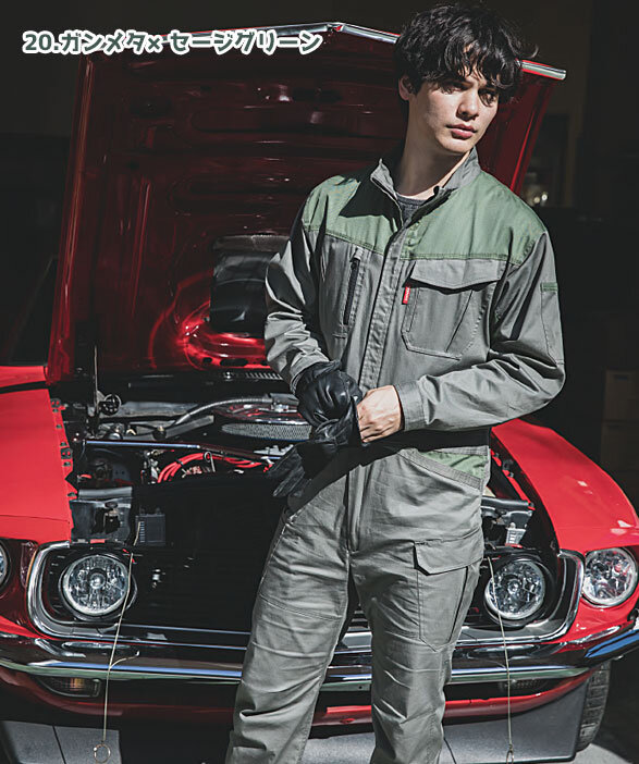 汚れがつきにくく再汚染が少ない加工を施したスモーキーバイカラーの新感覚なストレッチツナギ服。