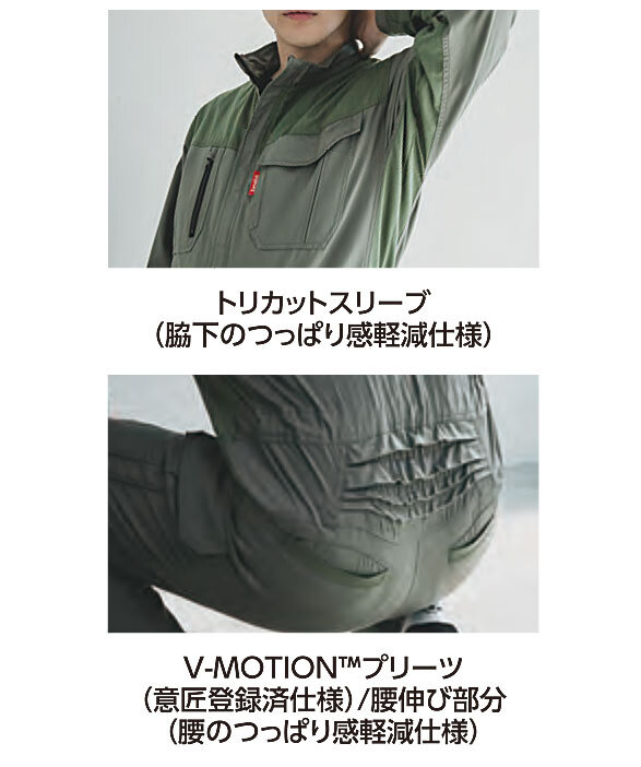 新たに脇下・腰伸び部分の仕様を見直し、クライミングカットも備えるなど、働く人や環境を考えた機能豊富なつなぎです。