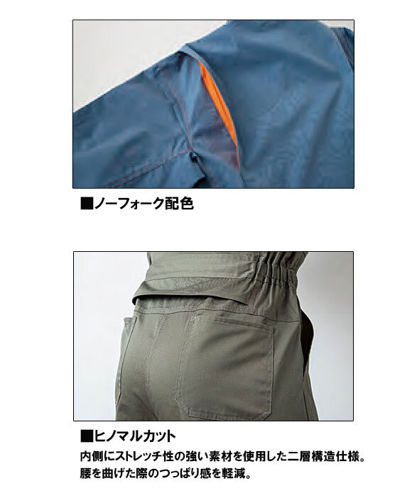 ■ヒノマルカット(腰部分の内側にストレッチ性の良い素材を使用した二層構造仕様。腰を曲げた際のツッパリ感を軽減。)