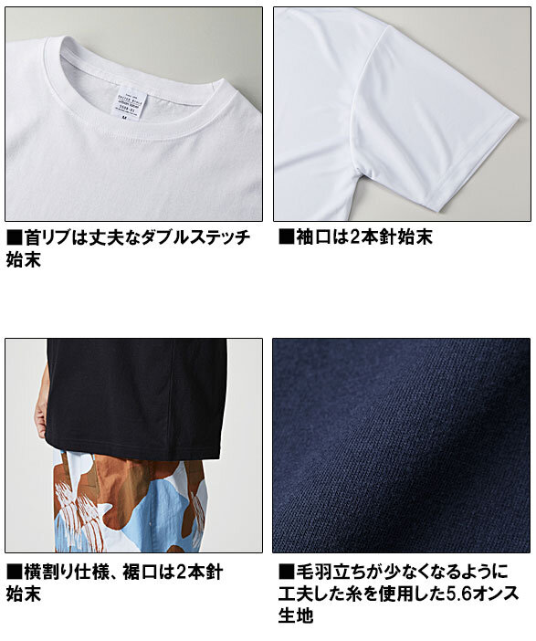 毛羽立ちが少なくなるように工夫した糸を使用した5.6オンス生地を使用。
