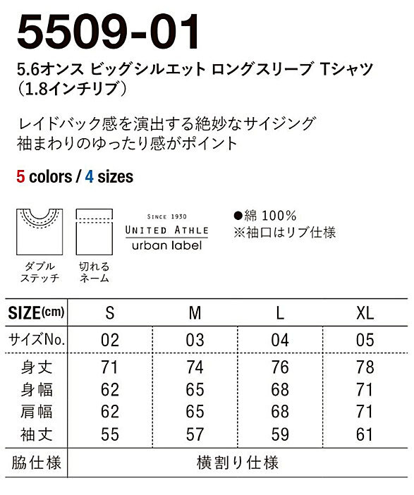 United Athle 5509-01 5.6オンス ビッグシルエット ロングスリーブTシャツ(1.8オンスリブ)