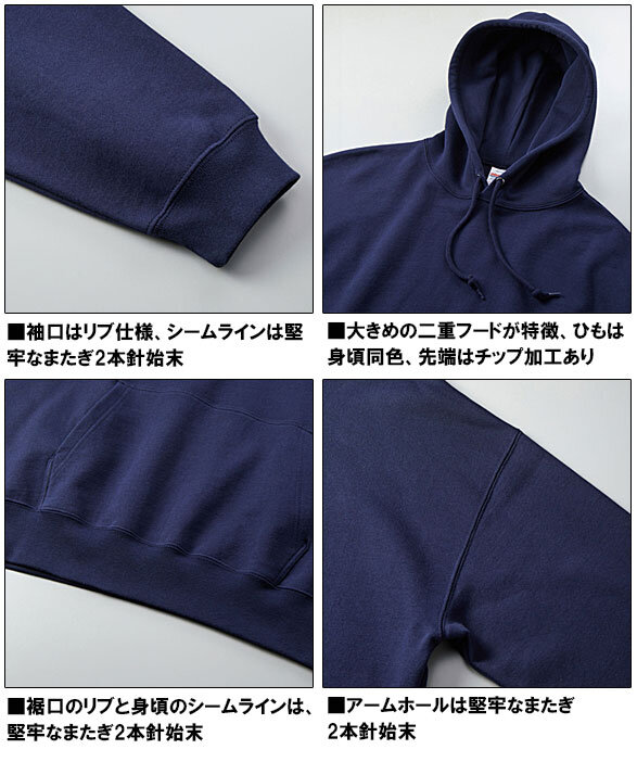 吸水性・伸縮性の優れた裏パイル地に、袖口・裾口にダブルステッチを施した、丈夫さとリラックス感を兼ね備えたスウェットプルオーバーパーカ。