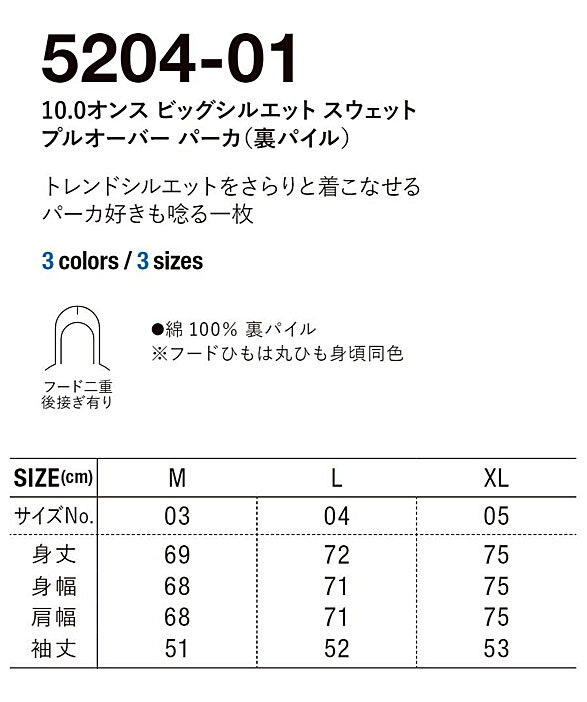 UnitedAthle 5204-01 10.0オンス ビッグシルエット スウェット プルオーバー パーカ(裏パイル)