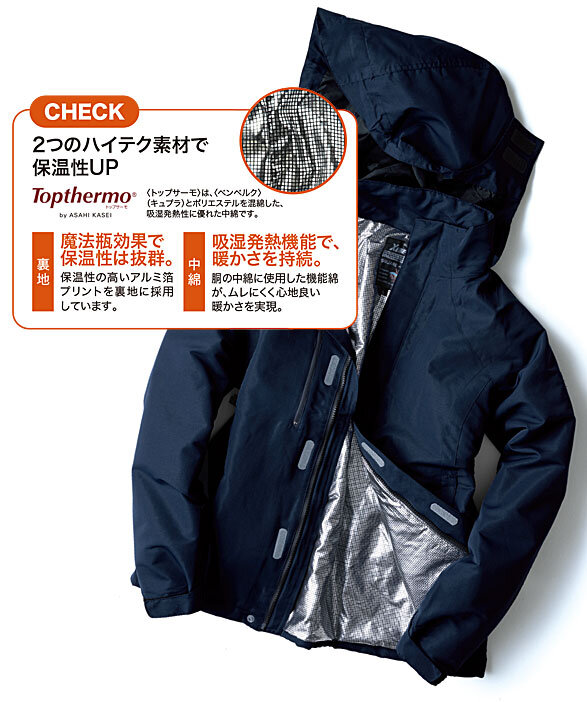 中綿に吸湿発熱機能綿トップサーモ、裏地にアルミプリントで高い保温性のスポーティ軽防寒ブルゾン。