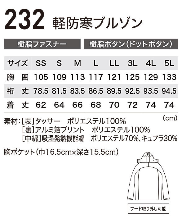 XE232 吸湿発熱機能素材の軽防寒ブルゾン
