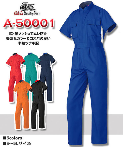 A50001 アコーディオンバック袖・脇メッシュ半袖ツナギ服 YKKファスナー使用