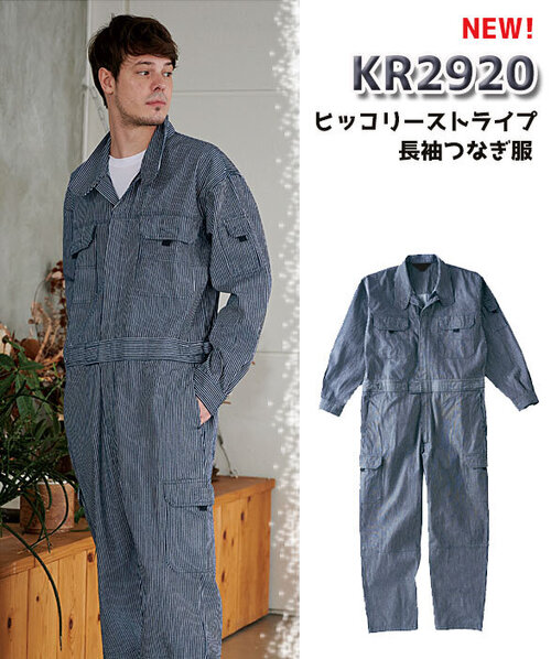 KR2920 ワンウォッシュ加工のヒッコリーストライプ長袖つなぎ服